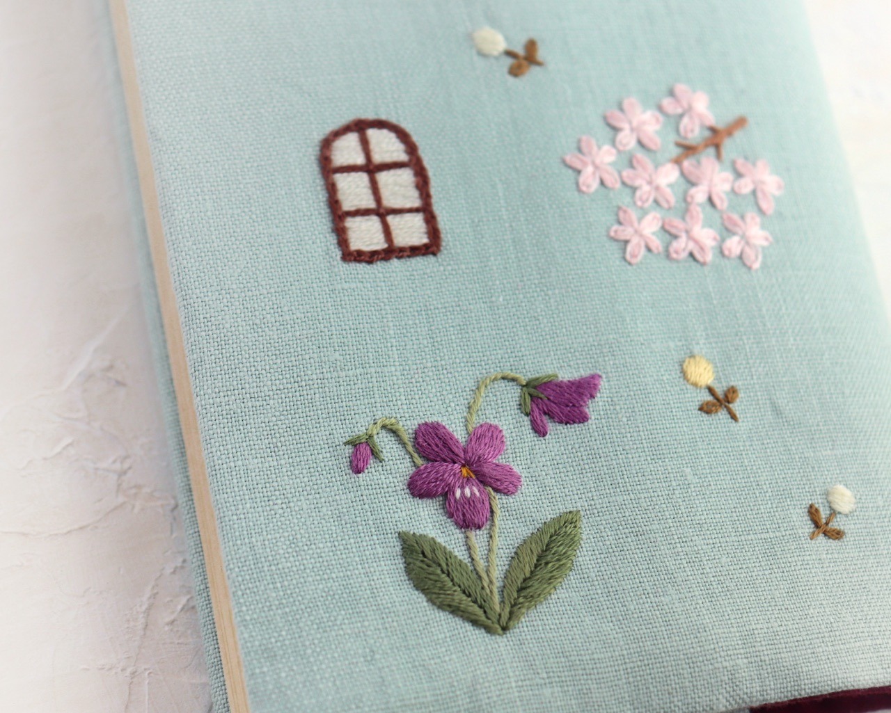 生地とスミレの配色がとても好きだったで、気持ち的にはしゃがんでスミレの花を見つめて、ふわっと空を見上げた感じ。