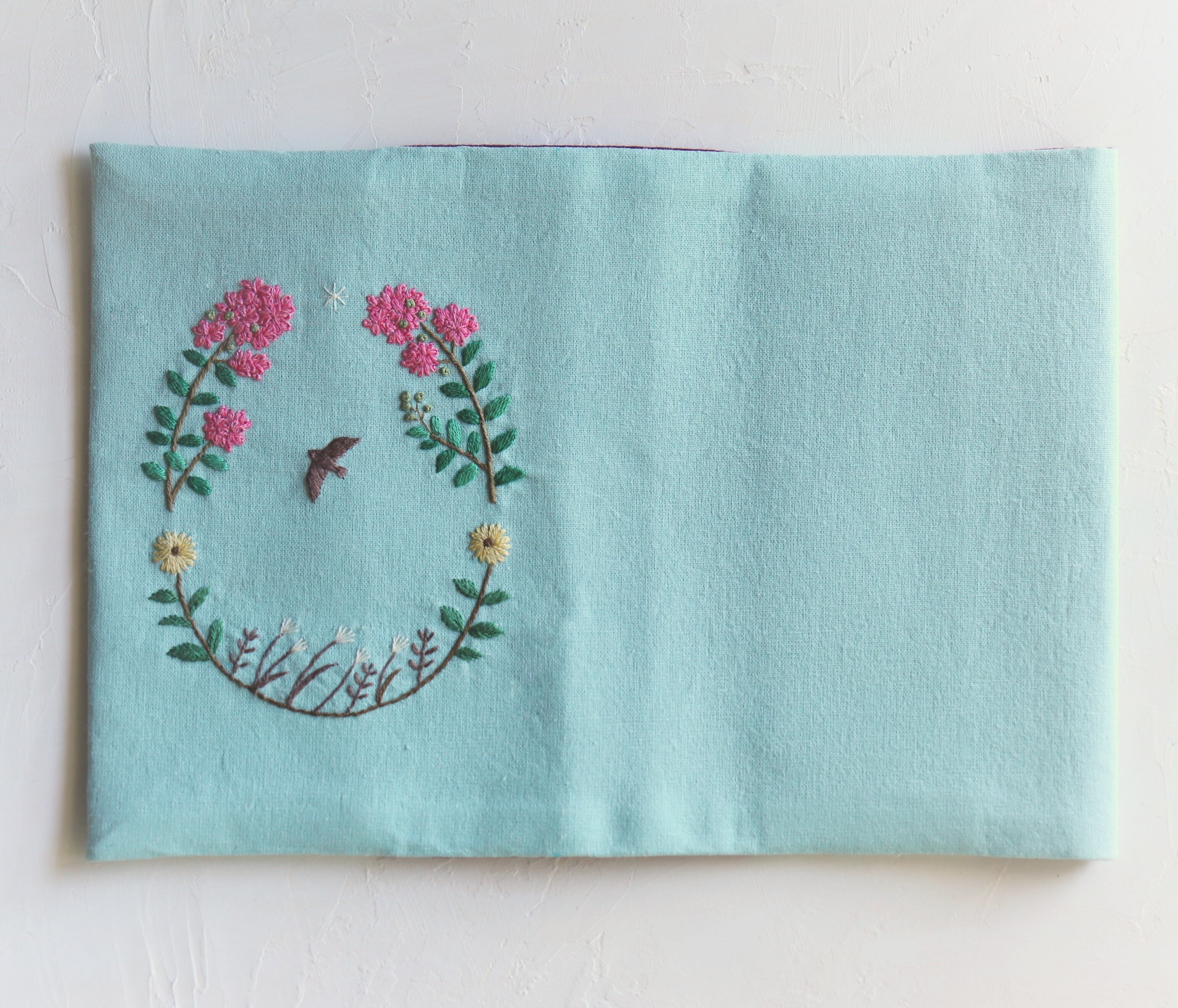 少しくすんだ柔らかな空色のコットンリネン生地に、百日紅(サルスベリ)の咲く風景を手刺繍で描きました。