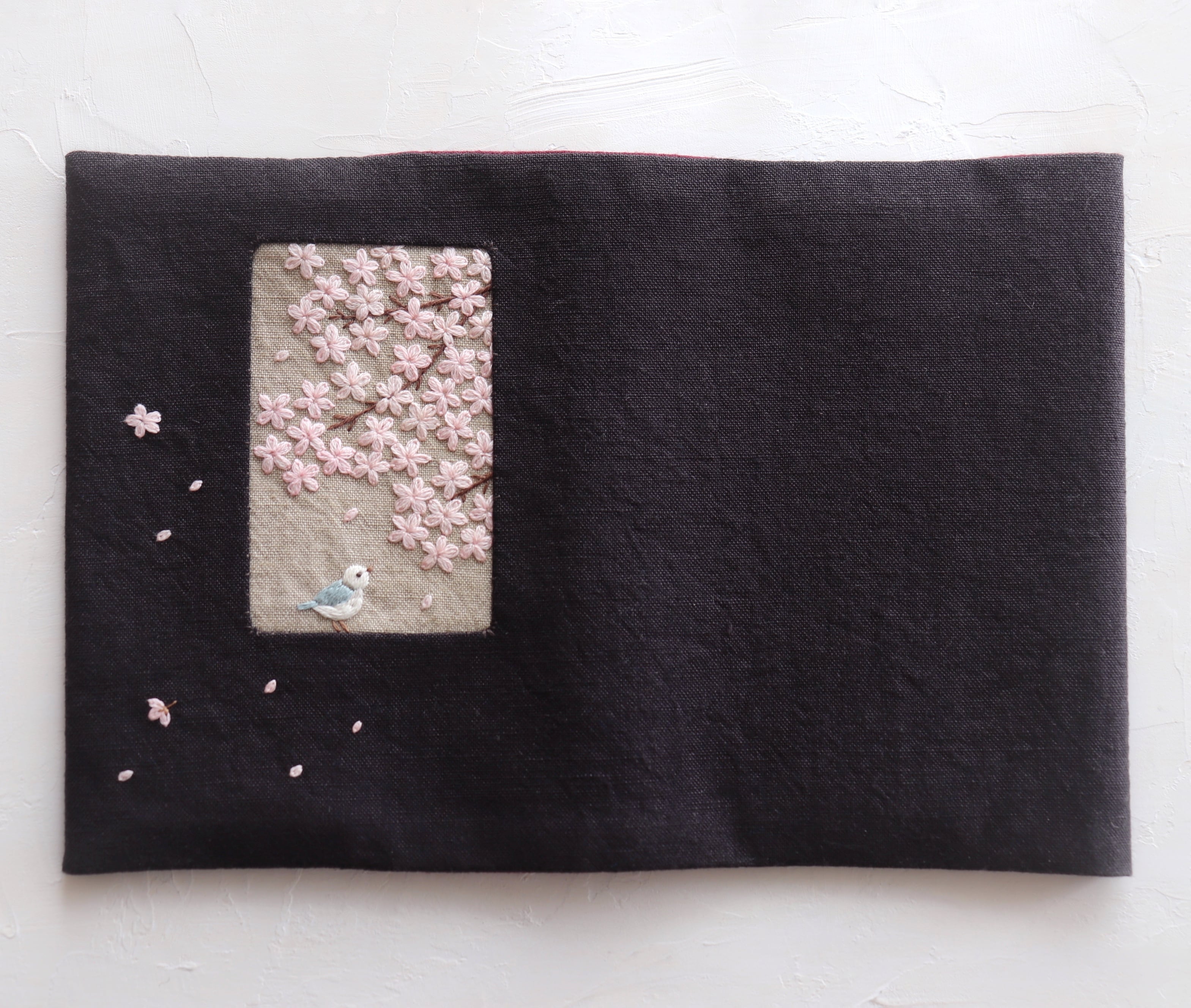 チャコールグレーのリネン生地に窓を開けて、桜の花咲く風景を手刺繍で描きました。
