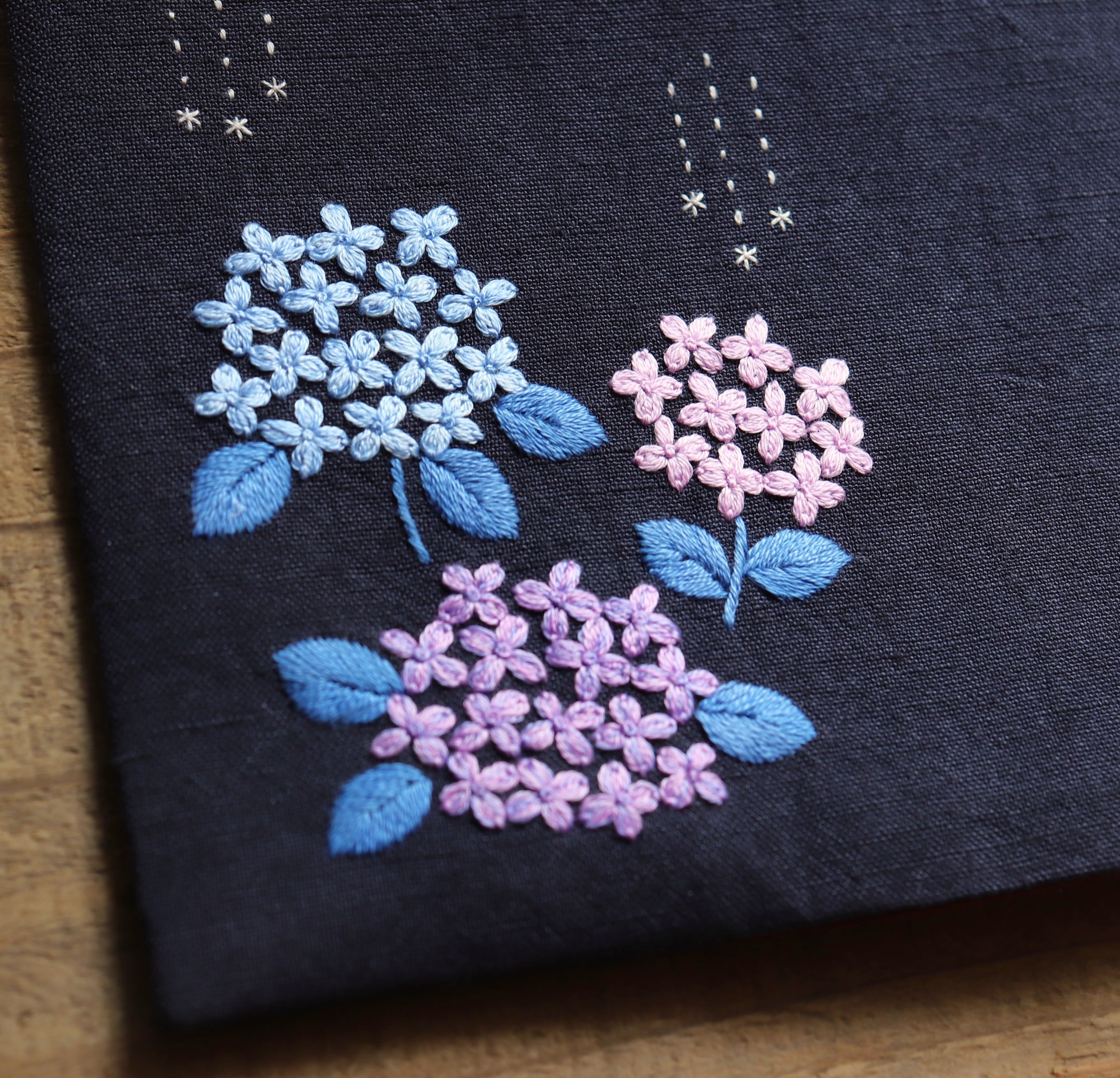 濃紺色のリネン生地に紫陽花の咲く風景を手刺繍で描きました。