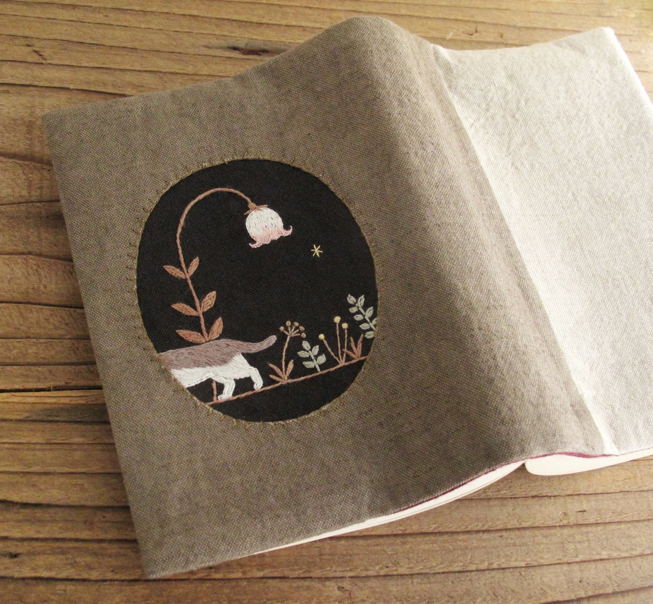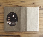 素朴な風合いの茶色のリネン生地に窓を開け、猫と野の草花の風景を手刺繍で描きました。