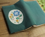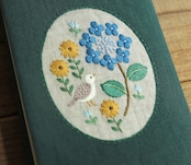 深みのあるグリーンのリネン生地に窓を開けて、紫陽花やルドベキアの咲く夏の庭の風景を刺繍で描きました。